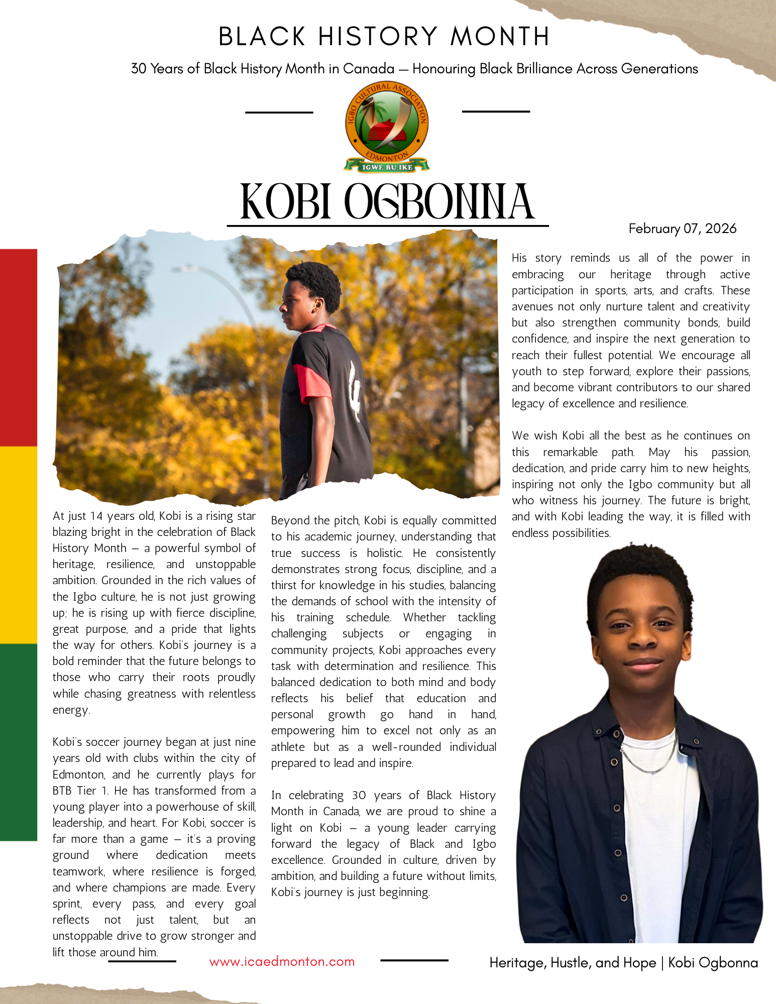 As we celebrate 30 years of Black History Month in Canada, the Igbo Cultural Association of Edmonton proudly shines a spotlight on Kobi — a remarkable 14-year-old whose journey embodies the power of heritage, relentless hustle, and boundless hope. Through soccer, academics, and a deep connection to his Igbo roots, Kobi is moving forward with purpose and passion, inspiring our community and the next generation to embrace their identity and chase their dreams without limits.
