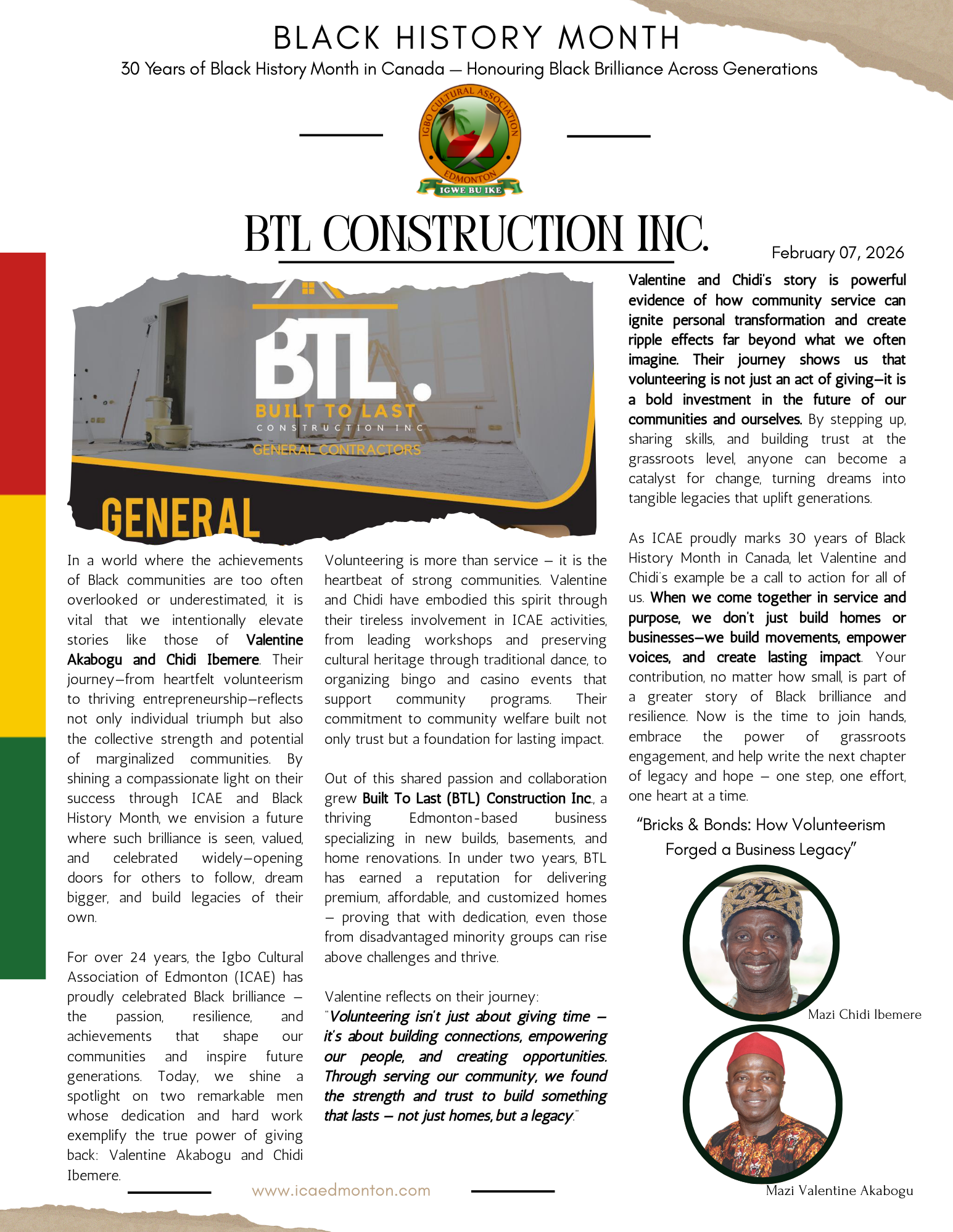 As part of our 30-year celebration of Black History Month in Canada, the Igbo Cultural Association of Edmonton proudly spotlights Valentine Akabogu and Chidi Ibemere, whose journey from dedicated community volunteers to founders of Built To Last Construction reflects the power of grassroots service, trust, and Black entrepreneurial excellence.