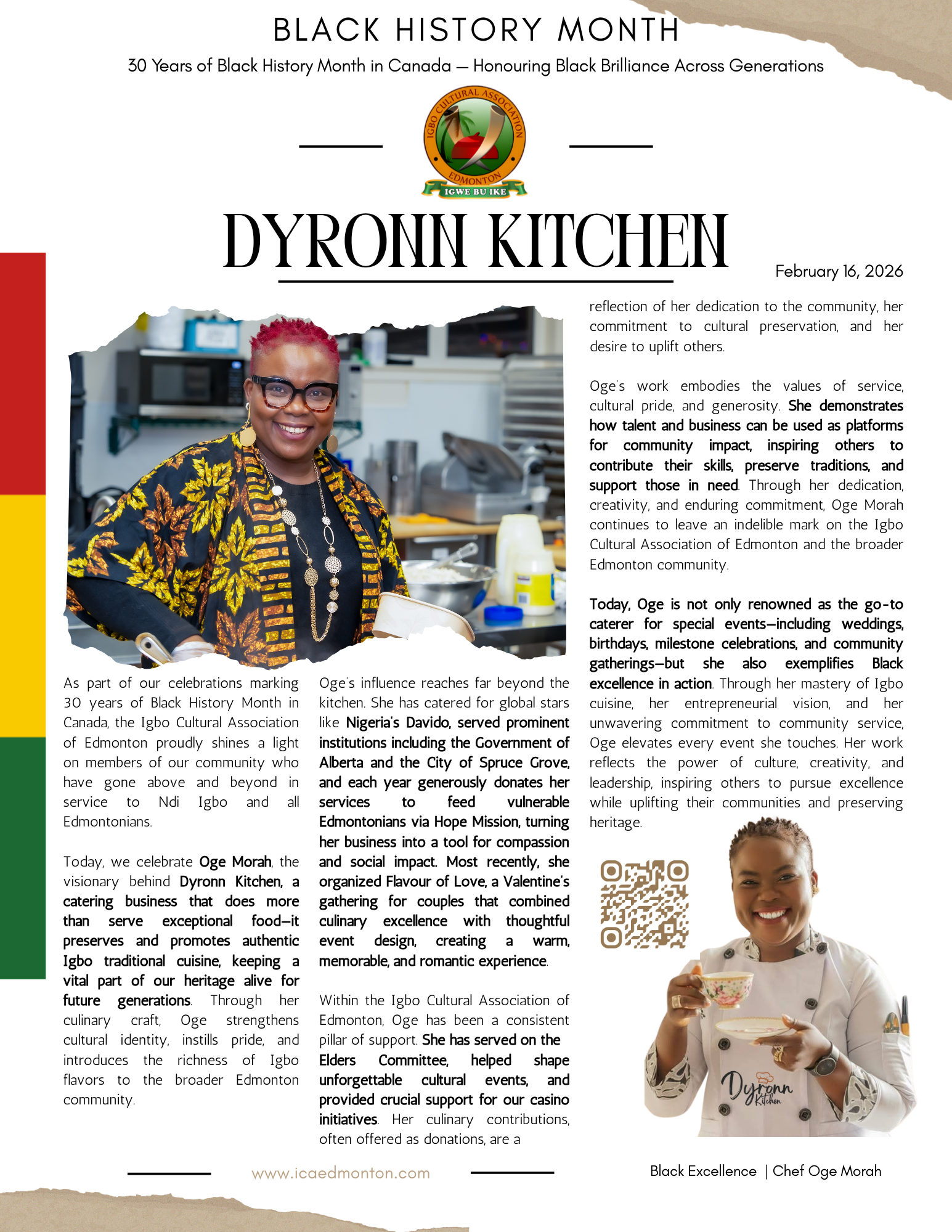 As part of our 30th-anniversary celebration of Black History Month in Canada, the Igbo Cultural Association of Edmonton proudly highlights Oge Morah, the culinary force behind Dyronn Kitchen, whose dedication to authentic Igbo cuisine, community service, and cultural preservation exemplifies leadership, generosity, and Black excellence.