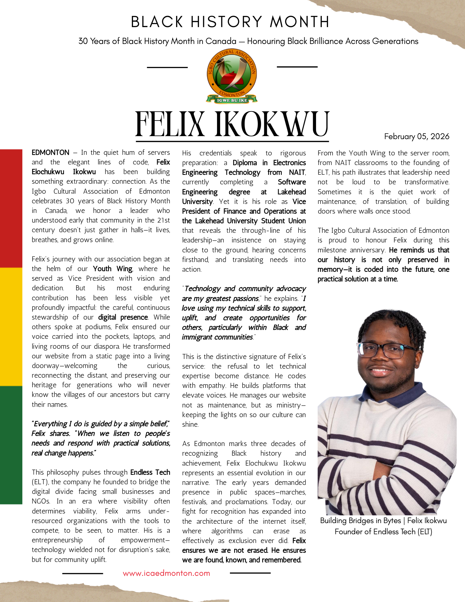 Felix Elochukwu Ikokwu is a software engineer, entrepreneur, and community advocate recognized by the Igbo Cultural Association of Edmonton during the 30th anniversary celebrations of Black History Month in Canada. He is the founder of Endless Tech (ELT) and a former Vice President of the ICAE Youth Wing.
