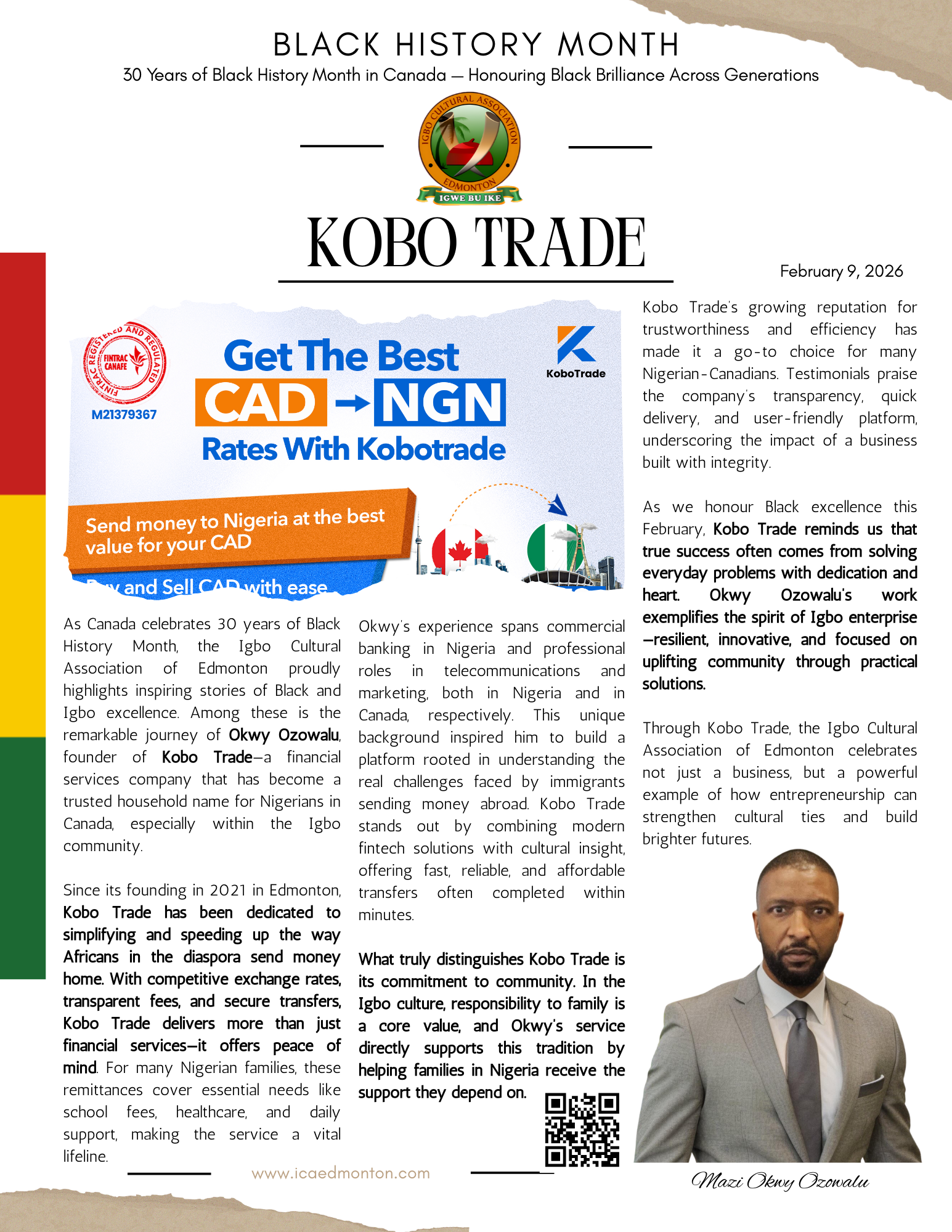 Welcome to our special feature celebrating Black and Igbo excellence during Canada’s 30th Black History Month. Discover how Okwy Ozowalu and Kobo Trade are transforming financial services for Nigerians in Canada—building trust, empowering families, and strengthening community connections across continents.