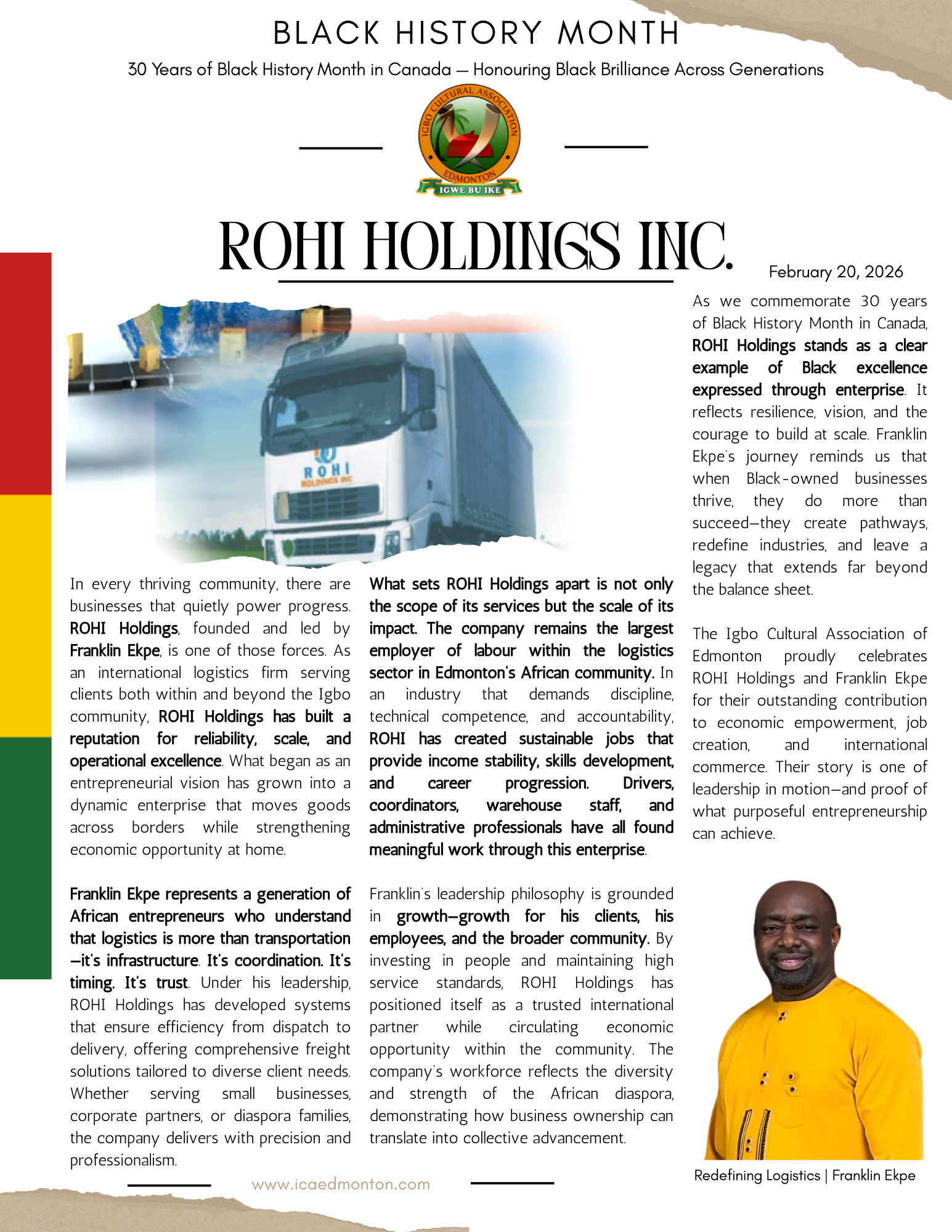 ROHI Holdings, founded by Franklin Ekpe, is an international logistics firm delivering dependable, high-level freight and cargo solutions to clients within and beyond the Igbo community. As the largest employer within the African community’s logistics sector, ROHI continues to set the standard for excellence, opportunity, and global reach.