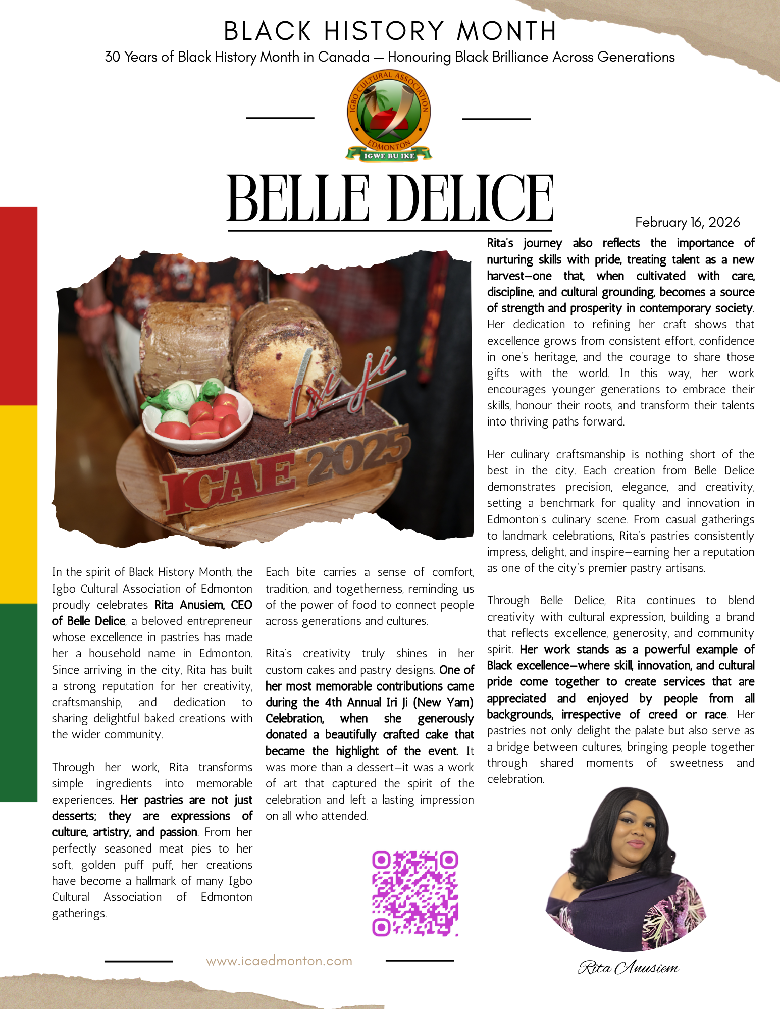 As part of our Black History Month celebrations, the Igbo Cultural Association of Edmonton proudly spotlights Rita Anusiem, the creative force behind Belle Delice, whose passion for pastries, innovation, and cultural pride continue to sweeten the lives of our community.